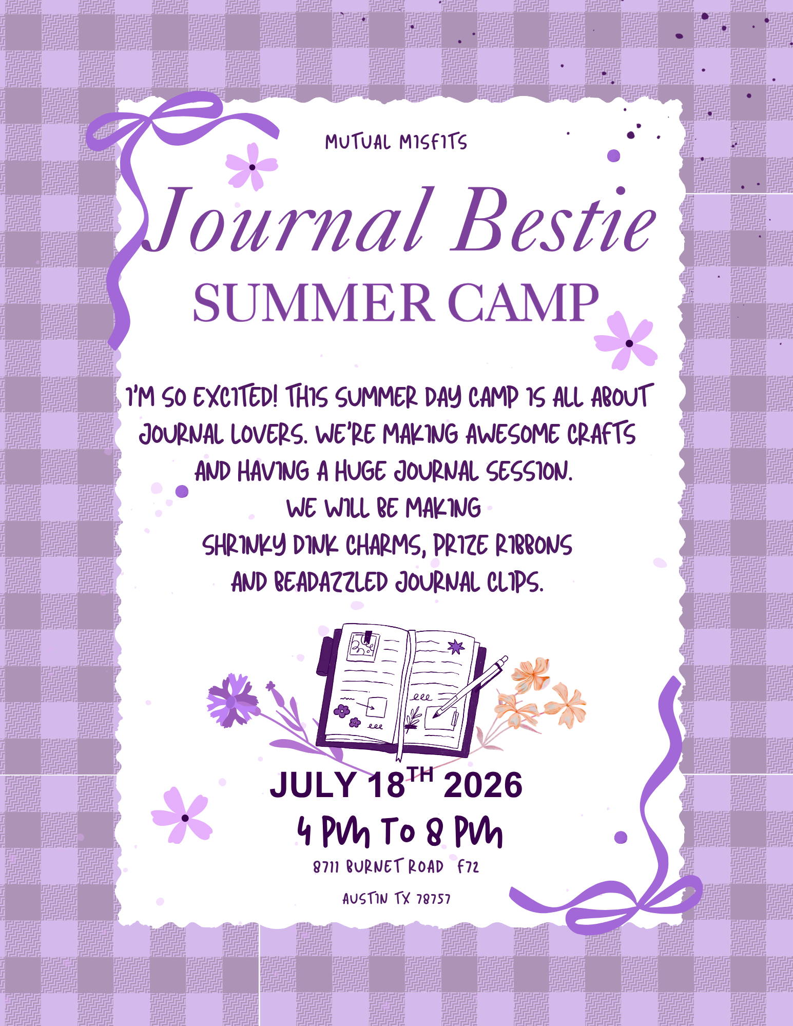 Calling all journal lovers and crafty chaos gremlins 💖 Ready to spend an evening making adorable, over-the-top creations and actually using your journal? This camp is part craft party, part creative hang, and 100% designed for you and your inner journal bestie.